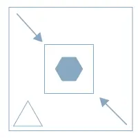 To ensure the consistency of these transformations, compare the third image in the sequence with the first image. According to our observations, the arrows in the third image should point outward, the shaded hexagon should flip to the top right, losing its color in the process, and the unshaded triangle located at the top right would move inside the unchanging middle square and become shaded.